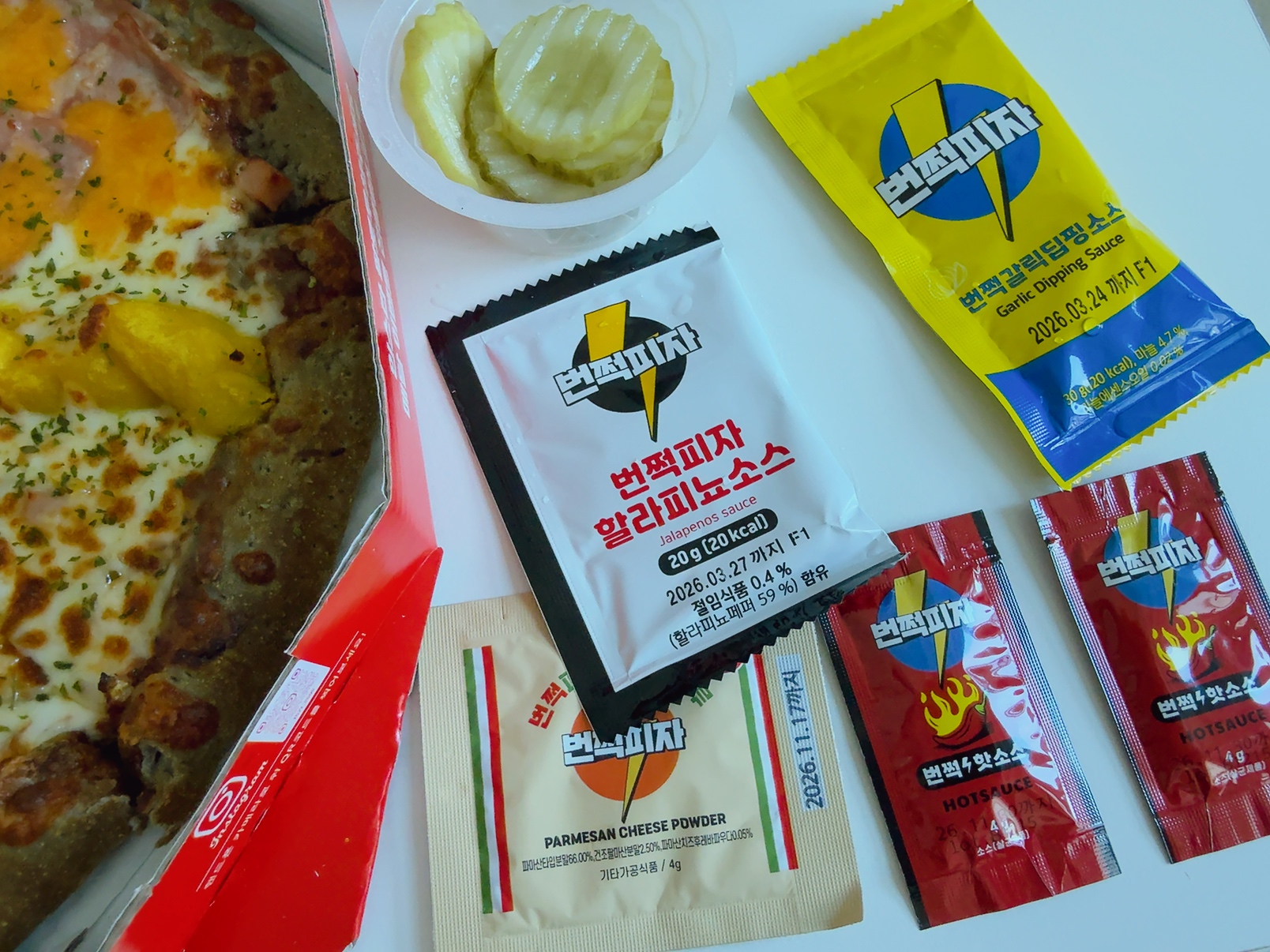난 번쩍피자는 처음이라서 갈릭딥핑소스를 추가해 말아 넣었다 뺐다 했는데