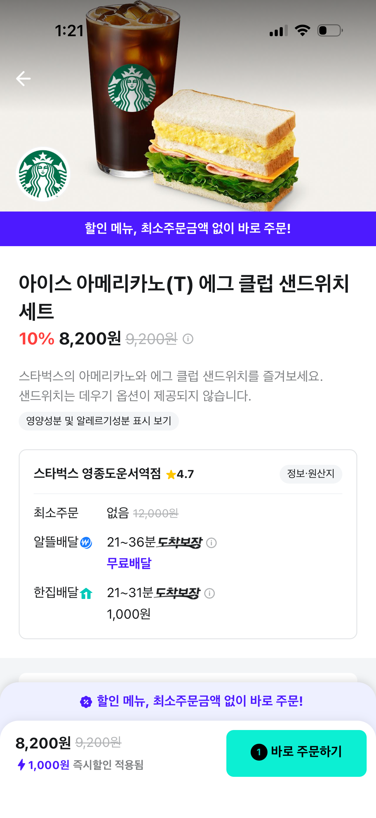 아이스 아메리카노 톨사이즈에 에그 클럽 샌드위치 세트
